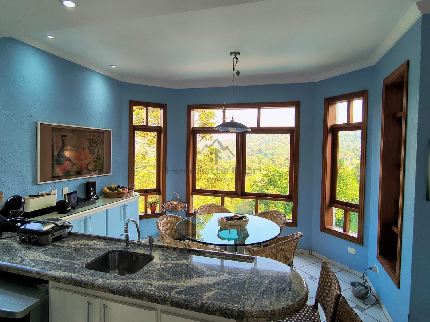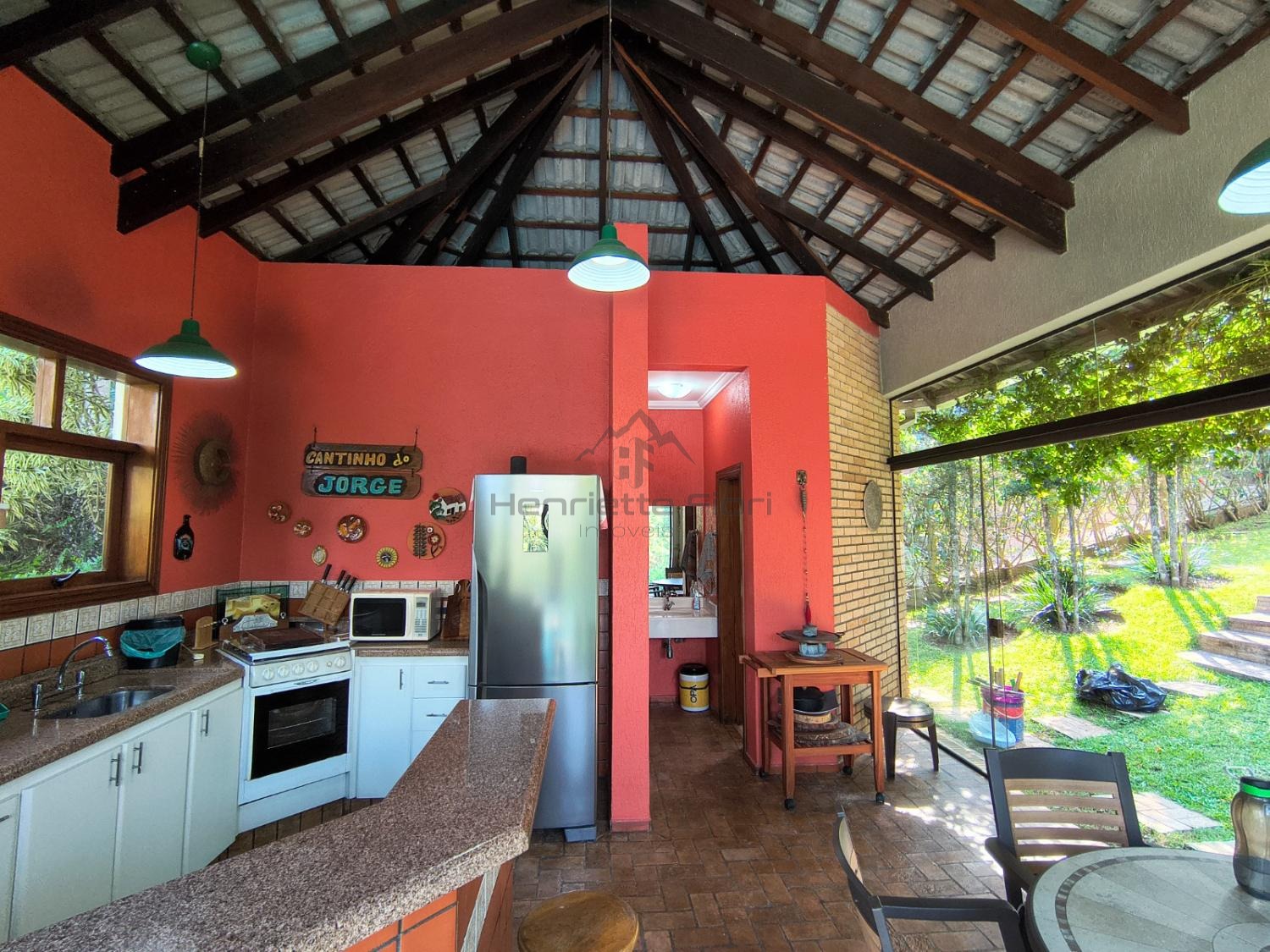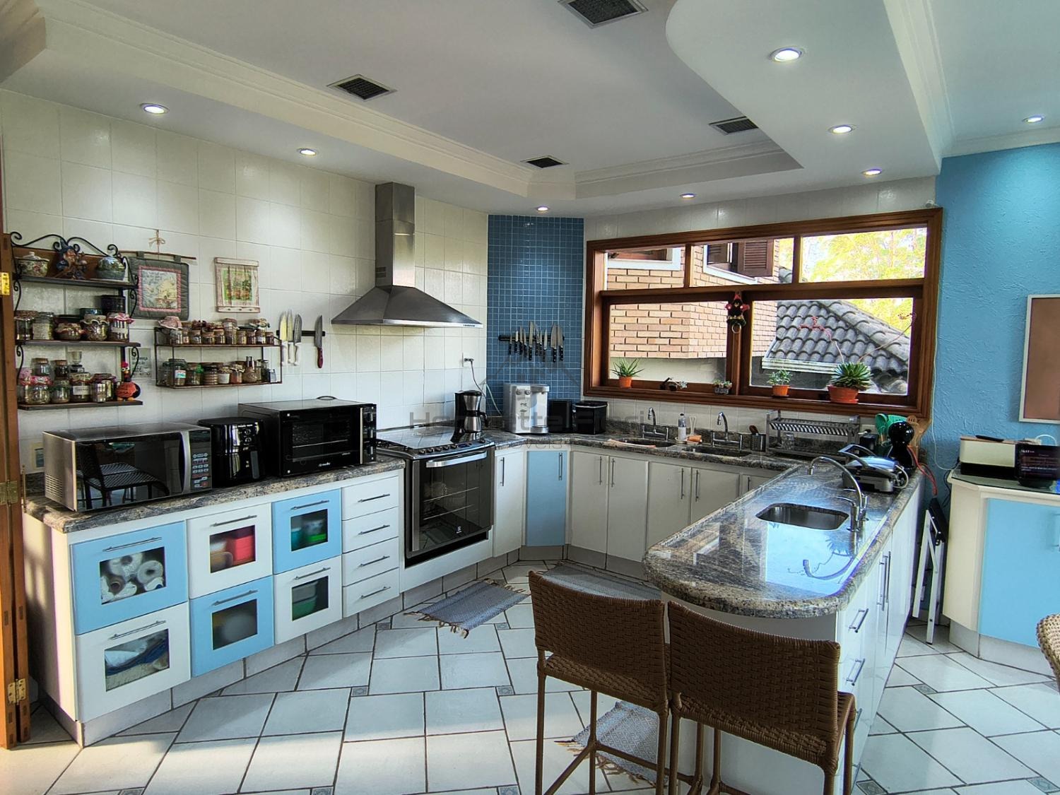 Cozinha ampla, moderna, totalmente equipada, com bancada e vista para a mata