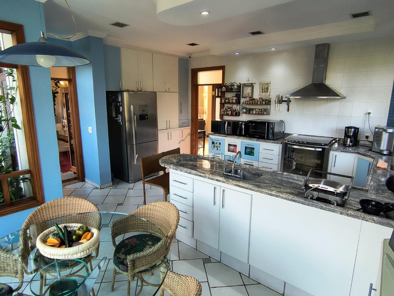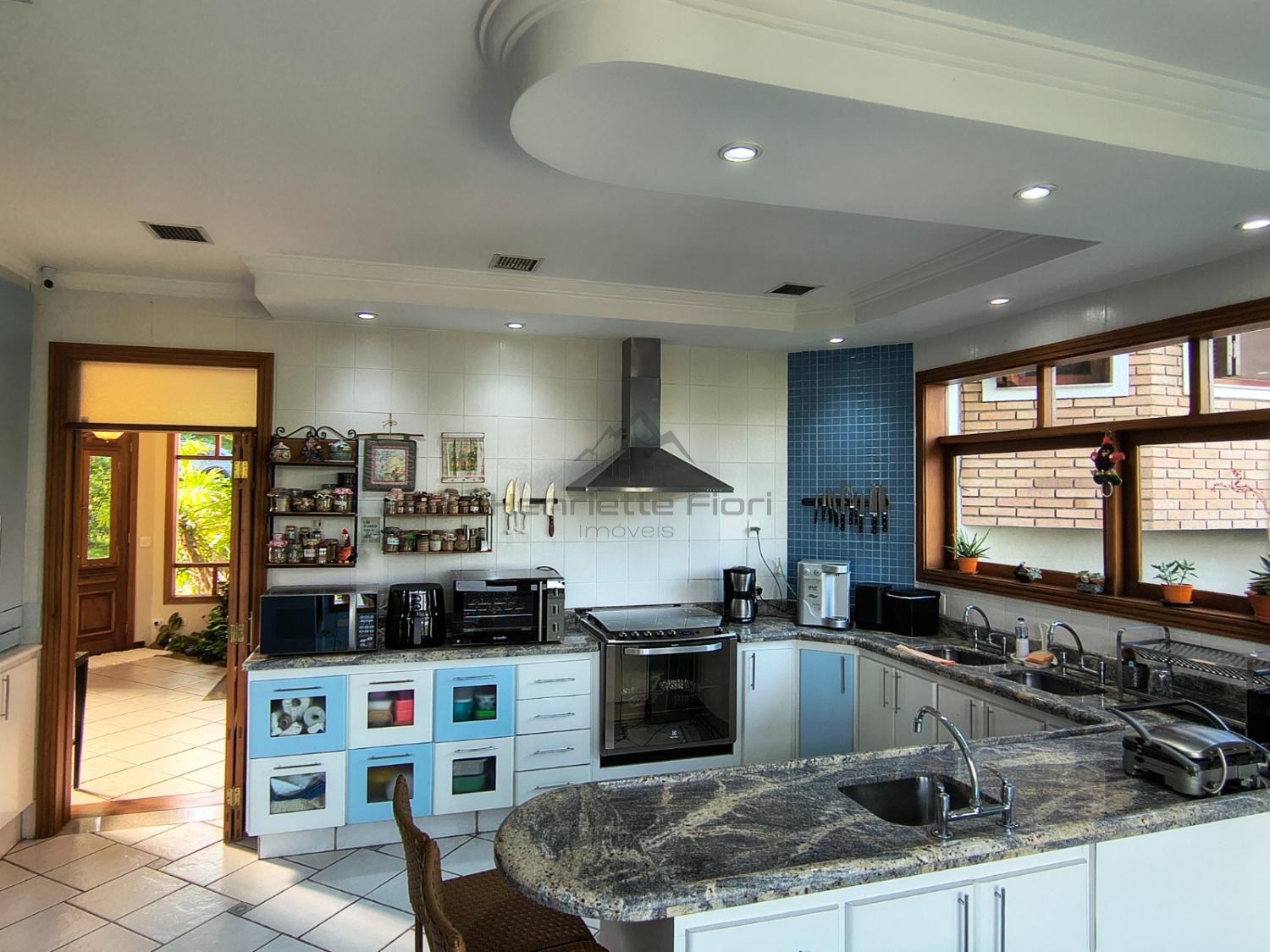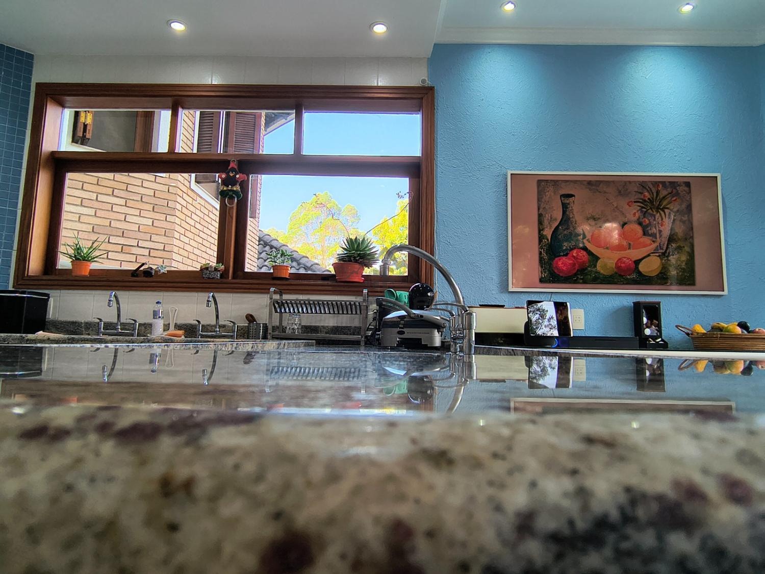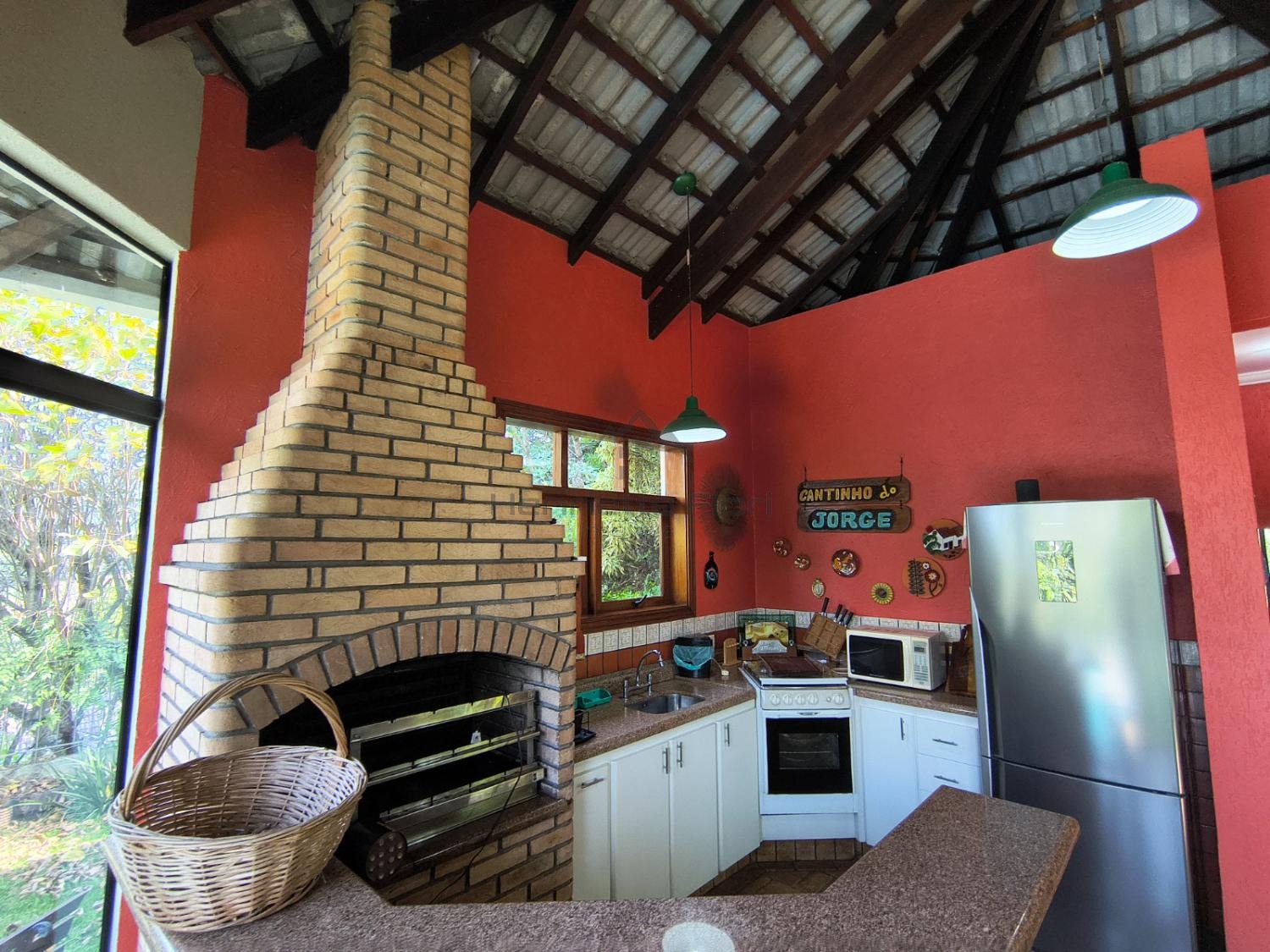 Cozinha ampla, moderna, totalmente equipada, com bancada e vista para a mata