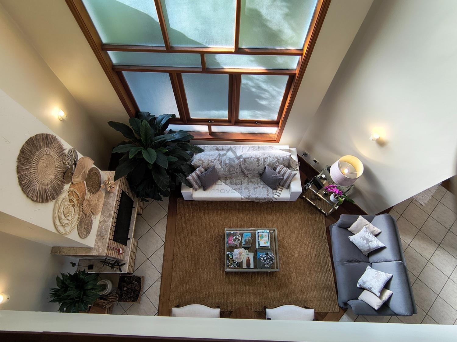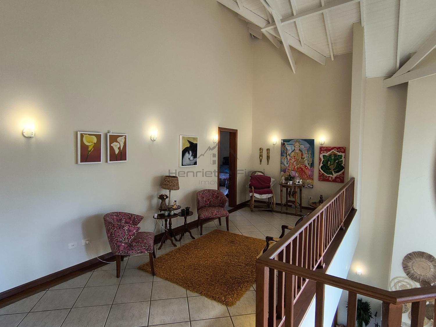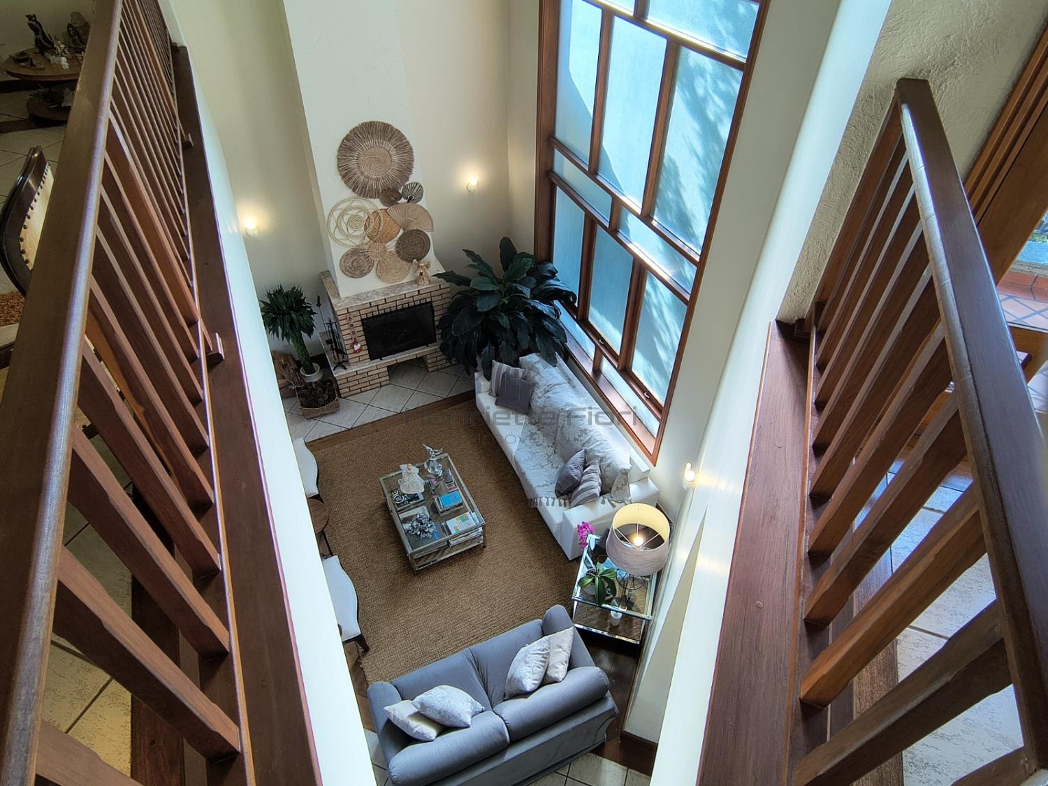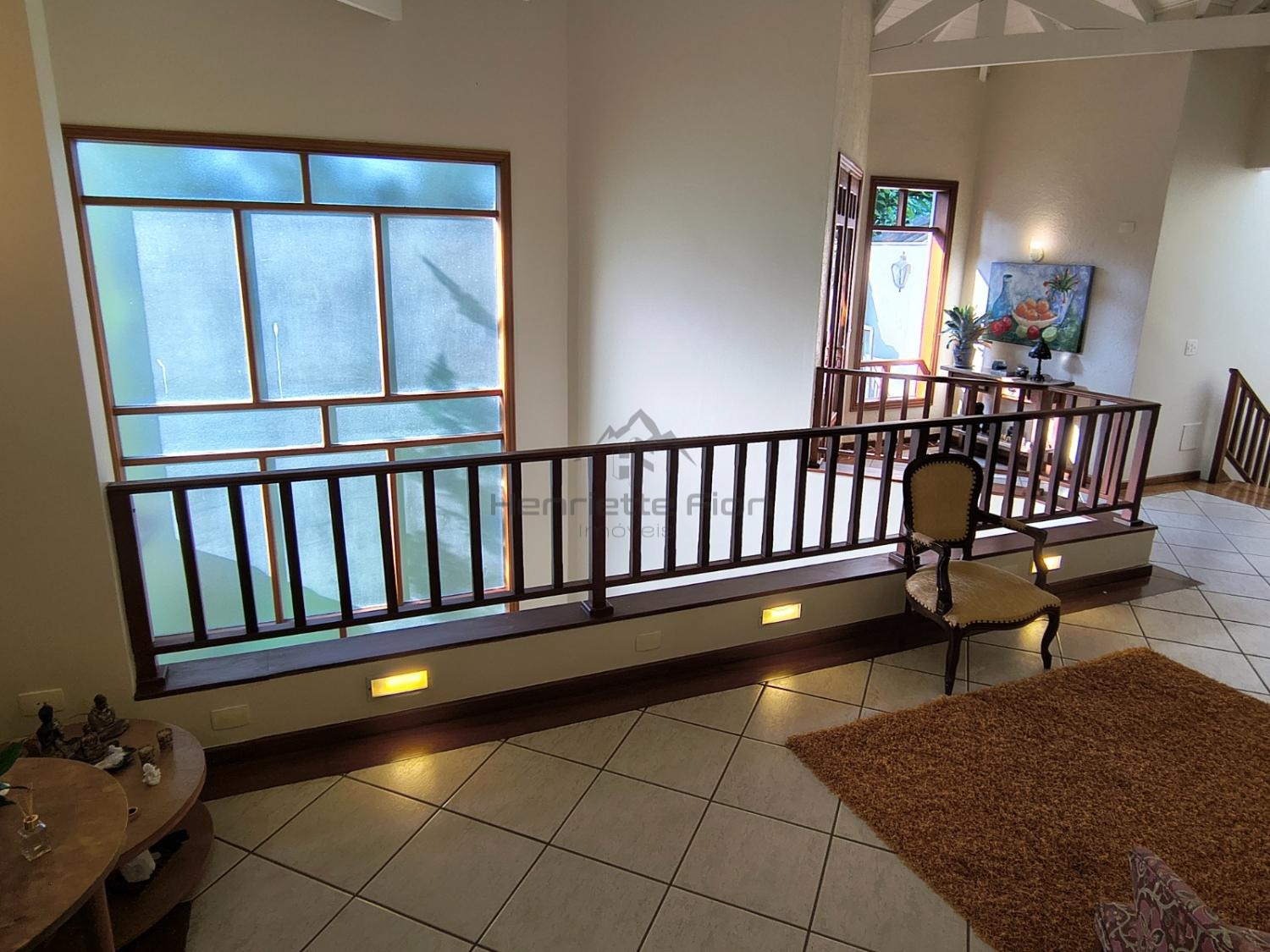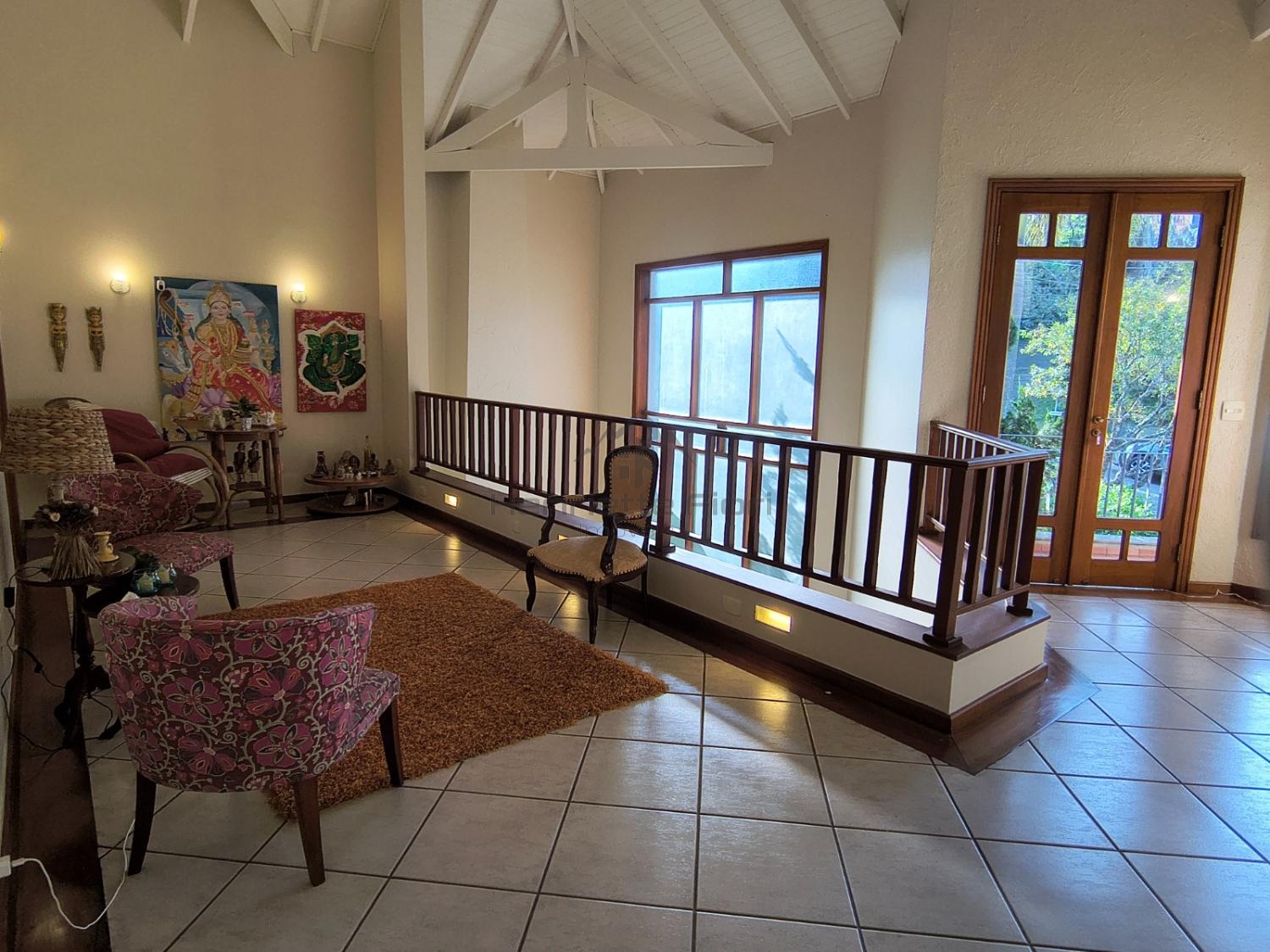 Sala íntima no piso superior com sacada e vista para a lareira