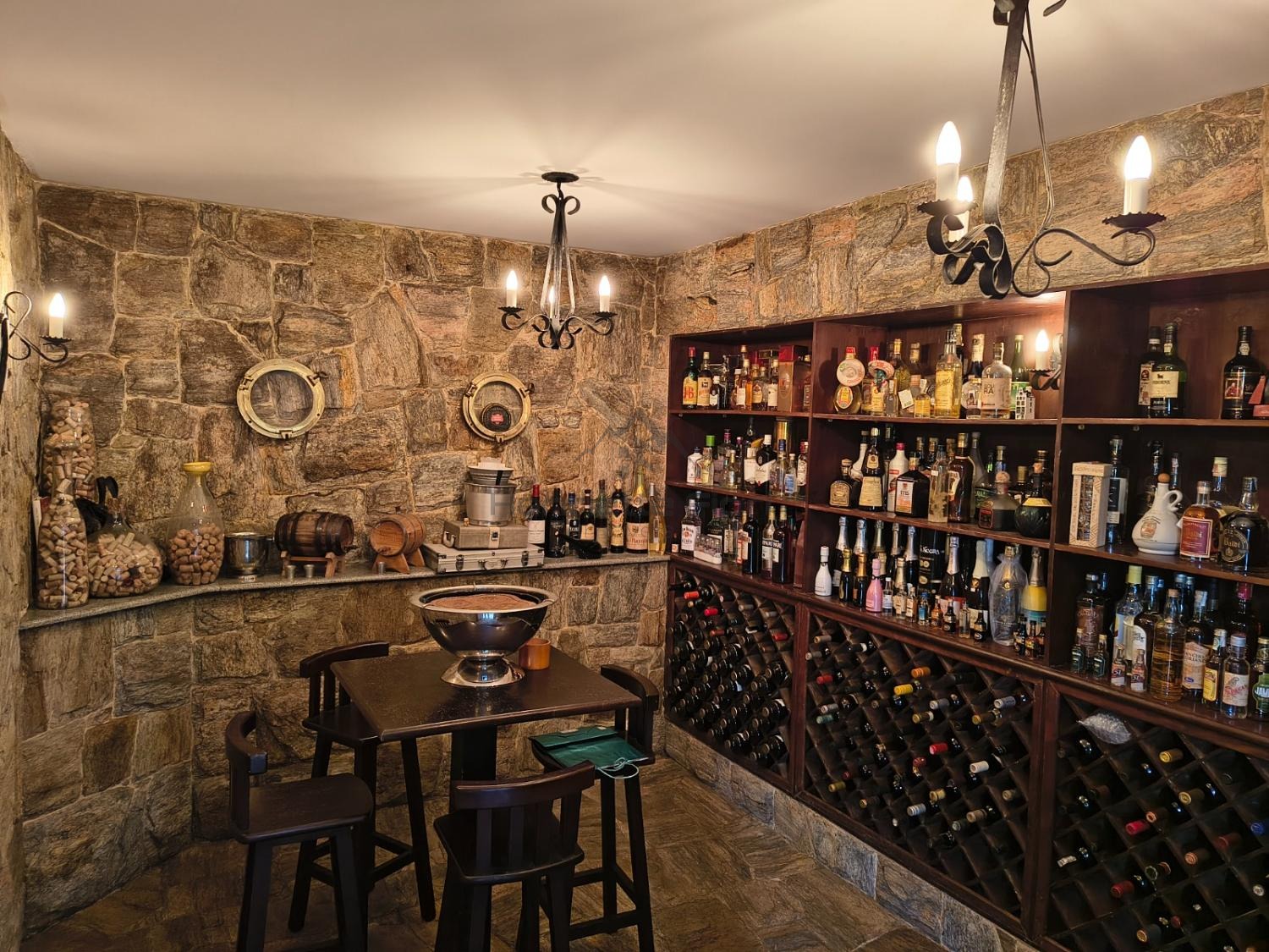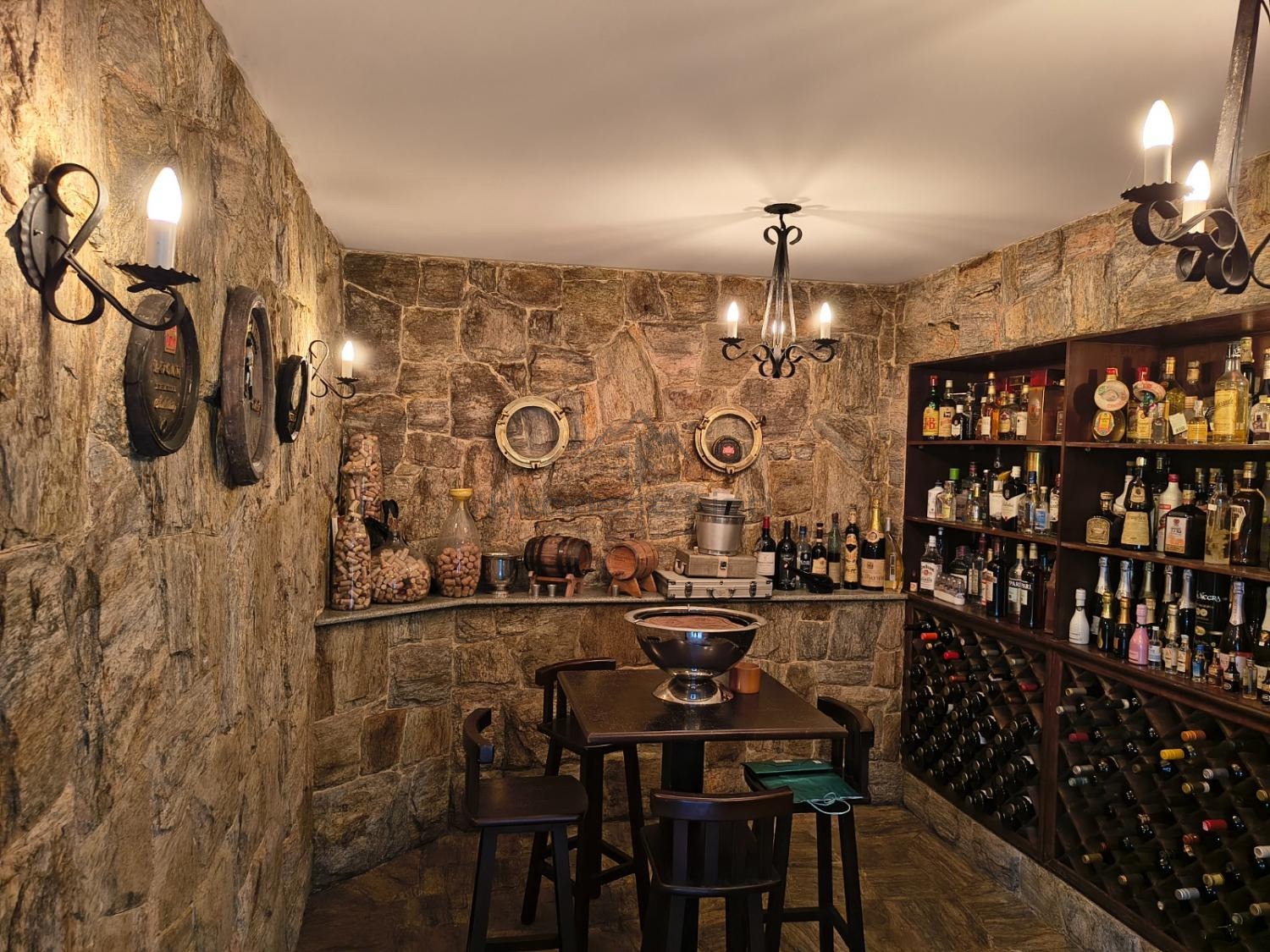 Adega em pedra integrada ao salão de jogos