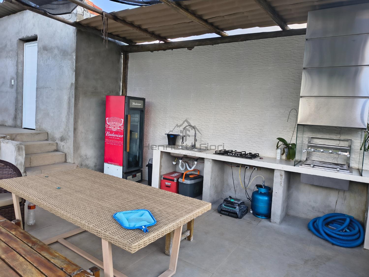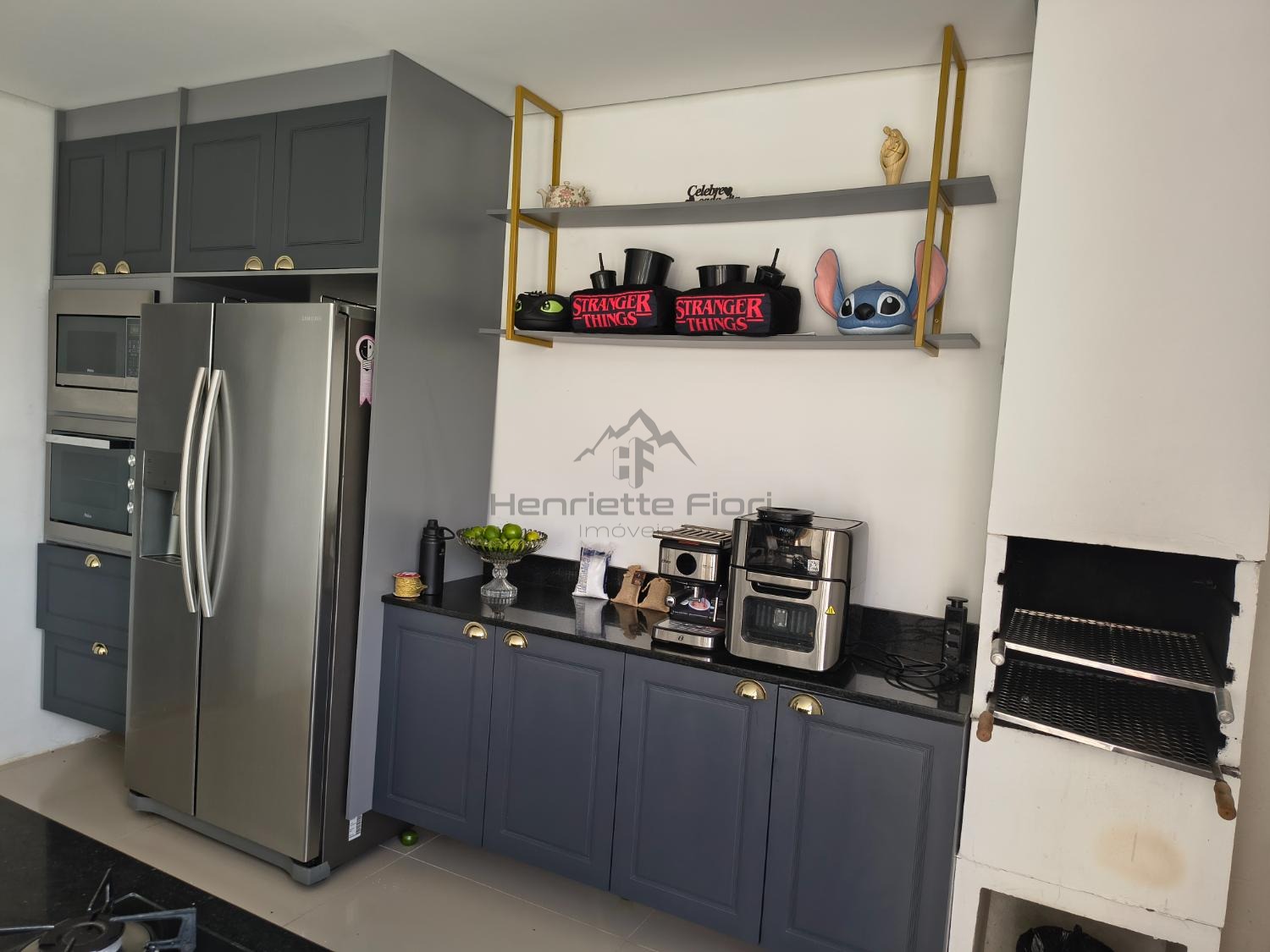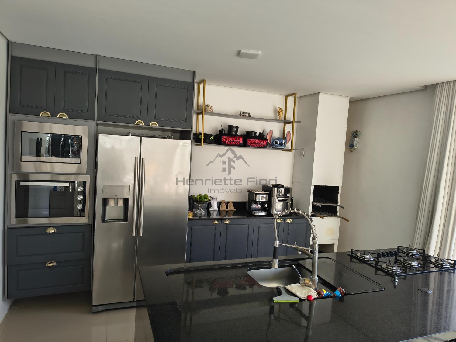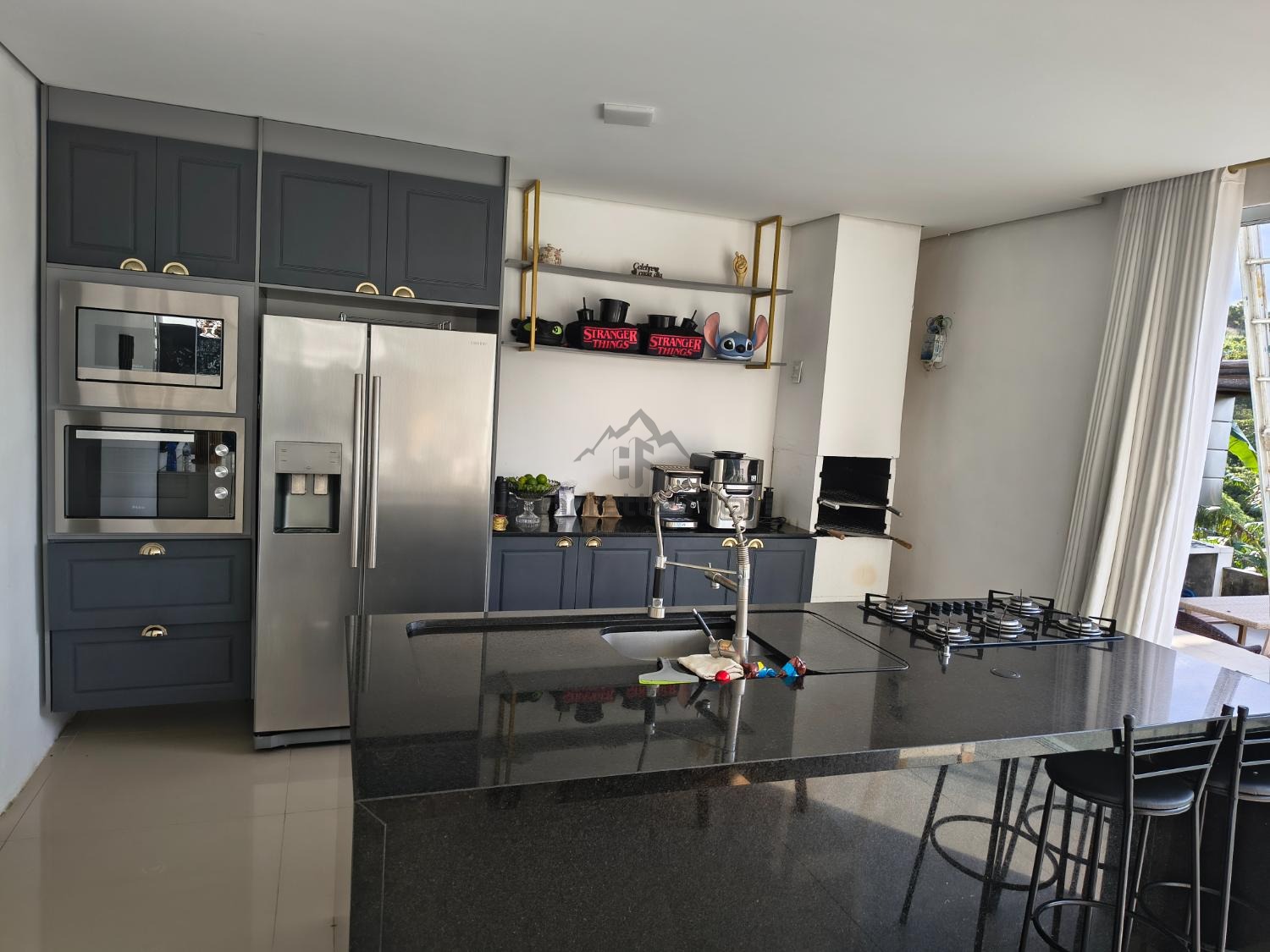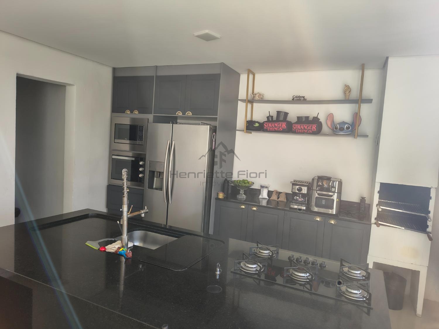Espaço gourmet completo com churrasqueira, duas cubas e cooktop a gás